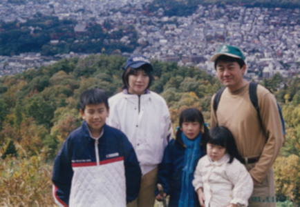父親の仕事の関係で東京都杉並区にて生を受けましたが、2歳のころには父の実家のある 京都市下京区に戻り、その後幼稚園から大学を卒業するまで京都府長岡京市にて両親と妹二人の5人家族で育ちました。 自宅は新興住宅地で、近所のたくさんの子どもたちと田んぼや畑で缶蹴りやドッジボールをしたり、段ボールで基地を作りレンジャーごっこなどをしたりして日が暮れるまで遊んでいたことを覚えています。